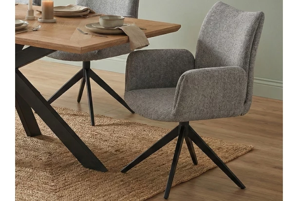 Jídelní židle s područkami v elegantním moderním stylu má pohodlně zaoblené opěradlo, otočný sedák a černou kovovou podnož. Očalouněna tkaninou v barvě holubí šedá. Židle se bude dokonale hodit do moderně zařízené jídelny, kde vynikne.