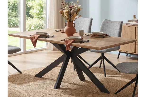 Obdélní jídelní stůl o velikosti 180×90 cm má jídelní desku z jasanové dýhy v zajímavém designu mozaiky. O stabilitu stolu se postará moderní členitá podnož z černého kovu. Tento stůl tak bude výrazným středobodem v moderní jídelně.