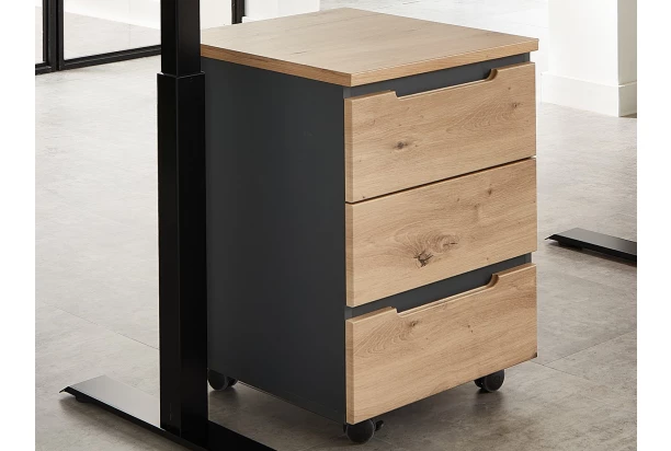 Úložný kontejner se zásuvkami z kancelářského programu Memphis – nábytek v moderním a zároveň funkčním designu zaujme zajímavou profilací předních ploch. Nábytek je vyroben v kontrastní kombinaci matný grafit s útulným dřevodekorem dub artisan. Tento kontejner se hodí do každé moderní kanceláře nebo domácí pracovny. Určen ideálně pro umístění k psacímu stolu a díky kolečkám lze snadno přesouvat.