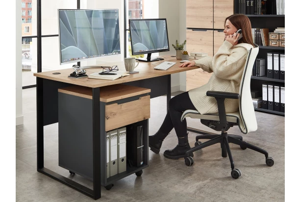 Psací stůl z kancelářského programu Memphis – moderní nábytek v kontrastní kombinaci matný grafit s útulným dřevodekorem dub artisan. Tento stůl s velkou pracovní plochou o velikosti 170×77 cm cm se hodí do každé moderní kanceláře nebo domácí pracovny. Kovová podnož stolu poskytuje kvalitní stabilitu při práci.