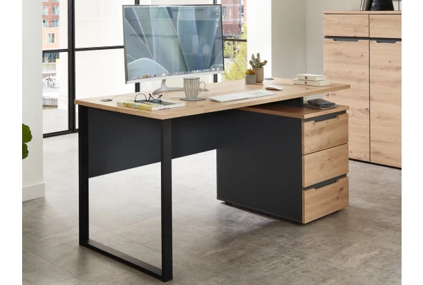 Psací stůl se zásuvkami z kancelářského programu Memphis – moderní nábytek v kontrastní kombinaci matný grafit s útulným dřevodekorem dub artisan. Tento stůl má praktickou úložnou boční skříňku se 3 zásuvkami, 2 boční otevřené přihrádky a odkládací plochu. Hodí se do každé moderní kanceláře nebo domácí pracovny.