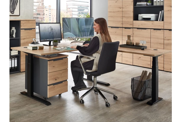 Rohový psací stůl s elektrickým nastavením výšky z programu Memphis – moderní nábytek v útulném dřevodekoru dub artisan. Tento rohový stůl s velkou pracovní plochou se hodí do každé moderní kanceláře nebo domácí pracovny, stůl lze smontovat jako pravý nebo levý roh. Tento stůl s elektricky výškově nastavitelným mechanismem Vám zpříjemní práci – pomocí panelu s tlačítky si pracovní plochu stolu kdykoliv, snadno a rychle přizpůsobíte aktuální potřebě. Můžete tak pracovat střídavě vsedě i vestoje, což ocení hlavně Vaše záda. Stůl má navíc funkci paměti pro vaše oblíbené polohy.