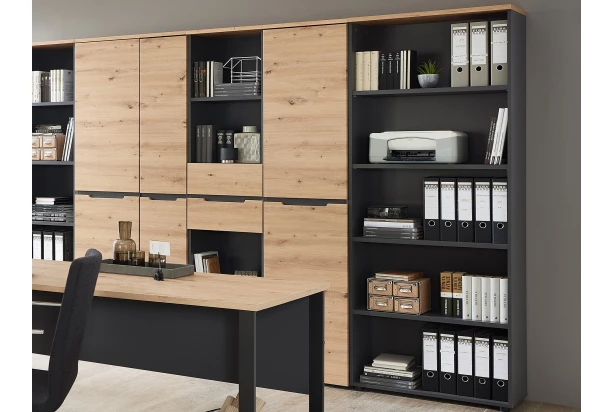 Vysoký regál z kancelářského programu Memphis – moderní nábytek v elegantním provedení matný grafit, doplněn o horní krycí desku v útulném dřevodekoru dub artisan. Odkládací police jsou ideální pro uspořádání knih, složek a pracovních materiálů v pracovně, koupelnových potřeb v koupelně anebo dekorativních předmětů v obývacím pokoji. Regál je možné využít v jakékoliv místnosti.