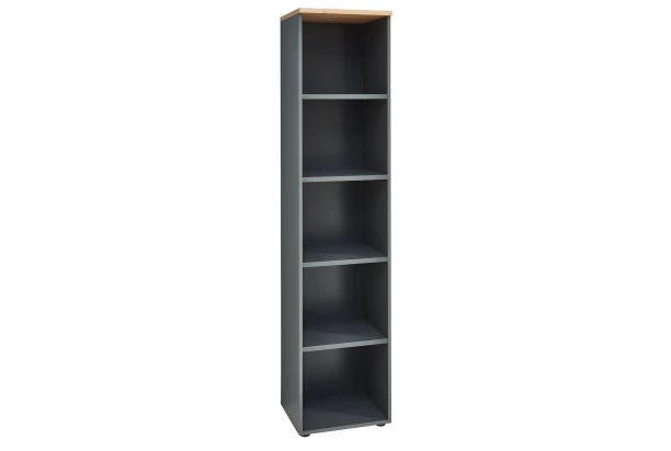 Úzký vysoký regál z kancelářského programu Memphis – moderní nábytek v elegantním provedení matný grafit, doplněn o horní krycí desku v útulném dřevodekoru dub artisan. Odkládací police jsou ideální pro uspořádání knih, složek a pracovních materiálů v pracovně, koupelnových potřeb v koupelně anebo dekorativních předmětů v obývacím pokoji. Regál je možné využít v jakékoliv místnosti.