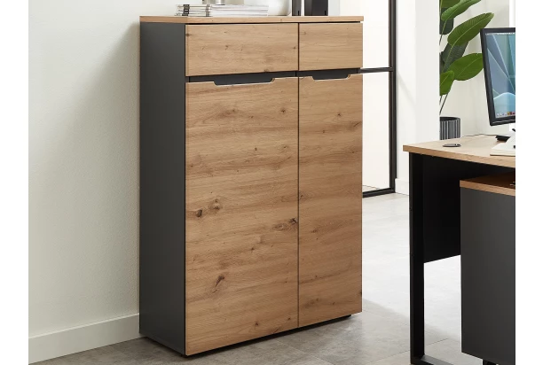 Úložná skříňka z kancelářského programu Memphis – nábytek v moderním a zároveň funkčním designu zaujme zajímavou profilací předních ploch. Nábytek je vyroben v kontrastní kombinaci grafit s útulným dřevodekorem dub artisan. Skříňka nabízí úložný prostor pro různé potřeby a předměty. Se svými kompaktními rozměry se dobře vejde do menších místností a přesto nabízí dostatek místa pro uložení knih, šanonů, ručníků a dalších předmětů. Tato 2-dveřová skříňka je všestranná a je ideální do pracovny, koupelny, chodby i obýváku. S rozměry 75×122×38 cm nabízí tato skříňka dostatek prostoru pro přehledné uložení nejrůznějších věcí.