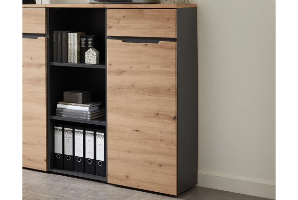 Úzká úložná skříňka z kancelářského programu Memphis – nábytek v moderním a zároveň funkčním designu zaujme zajímavou profilací předních ploch. Nábytek je vyroben v kontrastní kombinaci grafit s útulným dřevodekorem dub artisan. Skříňka nabízí úložný prostor pro různé potřeby a předměty. Se svými kompaktními rozměry se dobře vejde do menších místností a přesto nabízí dostatek místa pro uložení knih, šanonů, ručníků a dalších předmětů. Tato skříňka je všestranná a je ideální do pracovny, koupelny, chodby i obýváku. S rozměry 45×122×38 cm nabízí tato skříňka dostatek prostoru pro přehledné uložení nejrůznějších věcí.