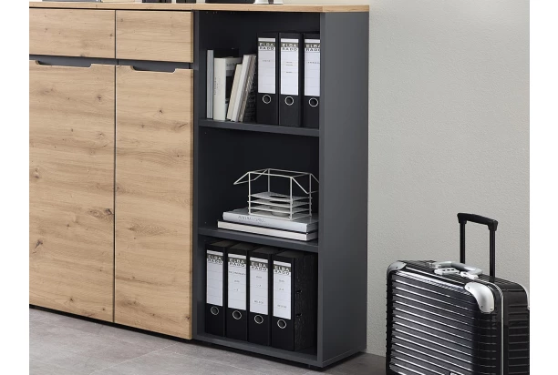 Úzký vysoký regál z kancelářského programu Memphis – moderní nábytek v elegantním provedení matný grafit, doplněn o horní krycí desku v útulném dřevodekoru dub artisan. Odkládací police jsou ideální pro uspořádání knih, složek a pracovních materiálů v pracovně, koupelnových potřeb v koupelně anebo dekorativních předmětů v obývacím pokoji. Regál je možné využít v jakékoliv místnosti.