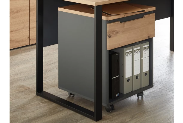 Úložný kontejner se zásuvkou z kancelářského programu Memphis – nábytek v moderním a zároveň funkčním designu zaujme zajímavou profilací předních ploch. Nábytek je vyroben v kontrastní kombinaci matný grafit s útulným dřevodekorem dub artisan. Tento kontejner se hodí do každé moderní kanceláře nebo domácí pracovny. Kontejner má zásuvku a odkládací přihrádku. Určen ideálně pro umístění k psacímu stolu a díky kolečkám lze snadno přesouvat.