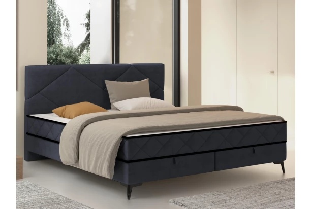 Moderní dvoulůžková postel s krásným geometrickým proševem zaujme v prostoru každé ložnice. Postel o velikosti lůžka 180×200 cm je očalouněna sametově lesklou látkou v barvě tmavě šedá, která působí luxusně a zároveň je odolná. Součástí této postele jsou kvalitní vysoké matrace s taštičkovým jádrem a studenou pěnou, které zajistí optimální komfort během spaní. Lůžko ve vyšší poloze je oblíbené, protože se z něj lépe vstává. V dolní části postele jsou ukryté praktické úložné prostory, které jsou přístupné z přední strany – pohodlně do nich uschováte například ložní prádlo. Díky zvýšené konstrukci na nožkách je údržba podlahy pod postelí snazší a můžete využít například i robotický vysavač.