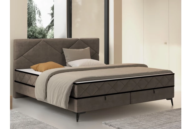 Moderní dvoulůžková postel s krásným geometrickým proševem zaujme v prostoru každé ložnice. Postel o velikosti lůžka 180×200 cm je očalouněna sametově lesklou látkou v barvě světle hnědá, která působí luxusně a zároveň je odolná. Součástí této postele jsou kvalitní vysoké matrace s taštičkovým jádrem a studenou pěnou, které zajistí optimální komfort během spaní. Lůžko ve vyšší poloze je oblíbené, protože se z něj lépe vstává. V dolní části postele jsou ukryté praktické úložné prostory, které jsou přístupné z přední strany – pohodlně do nich uschováte například ložní prádlo. Díky zvýšené konstrukci na nožkách je údržba podlahy pod postelí snazší a můžete využít například i robotický vysavač.