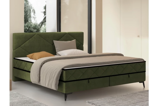 Moderní dvoulůžková postel s krásným geometrickým proševem zaujme v prostoru každé ložnice. Postel o velikosti lůžka 160×200 cm je očalouněna sametově lesklou látkou v barvě mechově zelená, která působí luxusně a zároveň je odolná. Součástí této postele jsou kvalitní vysoké matrace s taštičkovým jádrem a studenou pěnou, které zajistí optimální komfort během spaní. Lůžko ve vyšší poloze je oblíbené, protože se z něj lépe vstává. V dolní části postele jsou ukryté praktické úložné prostory, které jsou přístupné z přední strany – pohodlně do nich uschováte například ložní prádlo. Díky zvýšené konstrukci na nožkách je údržba podlahy pod postelí snazší a můžete využít například i robotický vysavač.