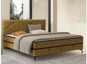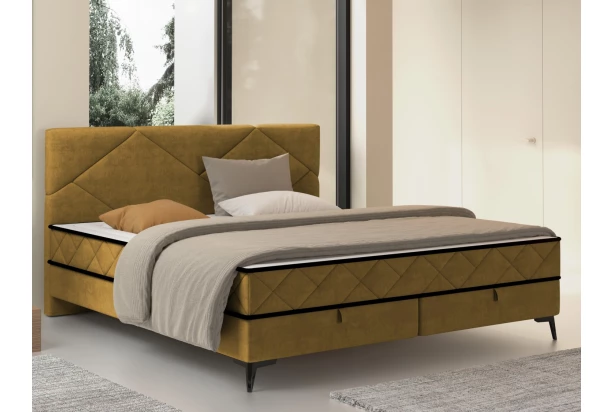 Moderní dvoulůžková postel s krásným geometrickým proševem zaujme v prostoru každé ložnice. Postel o velikosti lůžka 160×200 cm je očalouněna sametově lesklou látkou v barvě hořčicově žlutá, která působí luxusně a zároveň je odolná. Součástí této postele jsou kvalitní vysoké matrace s taštičkovým jádrem a studenou pěnou, které zajistí optimální komfort během spaní. Lůžko ve vyšší poloze je oblíbené, protože se z něj lépe vstává. V dolní části postele jsou ukryté praktické úložné prostory, které jsou přístupné z přední strany – pohodlně do nich uschováte například ložní prádlo. Díky zvýšené konstrukci na nožkách je údržba podlahy pod postelí snazší a můžete využít například i robotický vysavač.