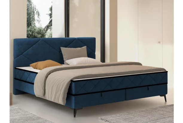 Moderní dvoulůžková postel s krásným geometrickým proševem zaujme v prostoru každé ložnice. Postel o velikosti lůžka 160×200 cm je očalouněna sametově lesklou látkou v barvě námořnická modrá, která působí luxusně a zároveň je odolná. Součástí této postele jsou kvalitní vysoké matrace s taštičkovým jádrem a studenou pěnou, které zajistí optimální komfort během spaní. Lůžko ve vyšší poloze je oblíbené, protože se z něj lépe vstává. V dolní části postele jsou ukryté praktické úložné prostory, které jsou přístupné z přední strany – pohodlně do nich uschováte například ložní prádlo. Díky zvýšené konstrukci na nožkách je údržba podlahy pod postelí snazší a můžete využít například i robotický vysavač.