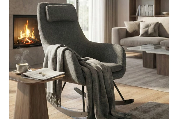 Elegantní houpací křeslo v moderním stylu nabízí příjemné pohodlí a zároveň bude hezkým designovým doplňkem nejen v prostoru obýváku. Během příjemného houpání si můžete užívat chvíle domácí pohody, sledovat televizi, číst si, přemýšlet anebo jen tak v klidu relaxovat. Zaoblené křeslo je očalouněno tkaninou v barvě středně šedá a díky vysokému opěradlu s měkkým polštářkem si pohodlně opřete i oblast hlavy. Podnož z kombinace černého kovu a dřeva zajistí stabilitu během při pohupování. Toto křeslo prakticky poslouží nejen v obýváku, ale i třeba v ložnici, kde vytvoří útulné zákoutí.