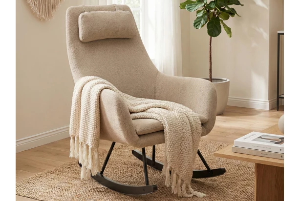Elegantní houpací křeslo v moderním stylu nabízí příjemné pohodlí a zároveň bude hezkým designovým doplňkem nejen v prostoru obýváku. Během příjemného houpání si můžete užívat chvíle domácí pohody, sledovat televizi, číst si, přemýšlet anebo jen tak v klidu relaxovat. Zaoblené křeslo je očalouněno tkaninou v barvě béžová a díky vysokému opěradlu s měkkým polštářkem si pohodlně opřete i oblast hlavy. Podnož z kombinace černého kovu a dřeva zajistí stabilitu během při pohupování. Toto křeslo prakticky poslouží nejen v obýváku, ale i třeba v ložnici, kde vytvoří útulné zákoutí.