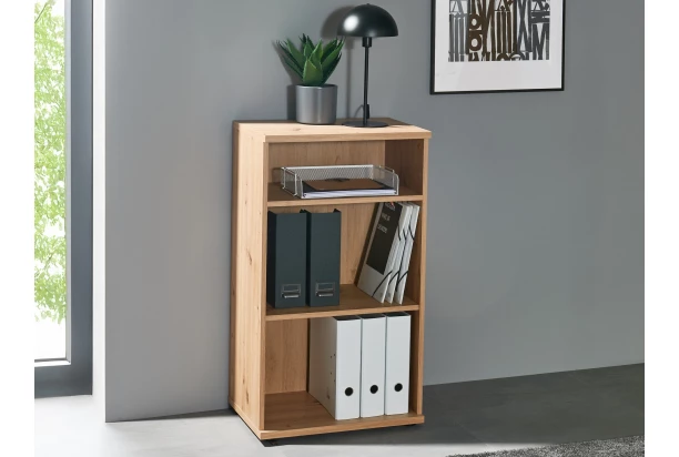 Nízký regál z programu Kanada – moderní nábytek v dřevodekoru dub artisan vytvoří příjemné prostředí, kde se budete cítit útulně. Rovné linie nábytku snadno pasují do jakéhokoliv moderně zařízeného interieru. Tento stojací regál nabízí 3 otevřené přihrádky s policemi, které jsou ideální pro vystavení knih, dekorací, složek a pracovních materiálů v pracovně.