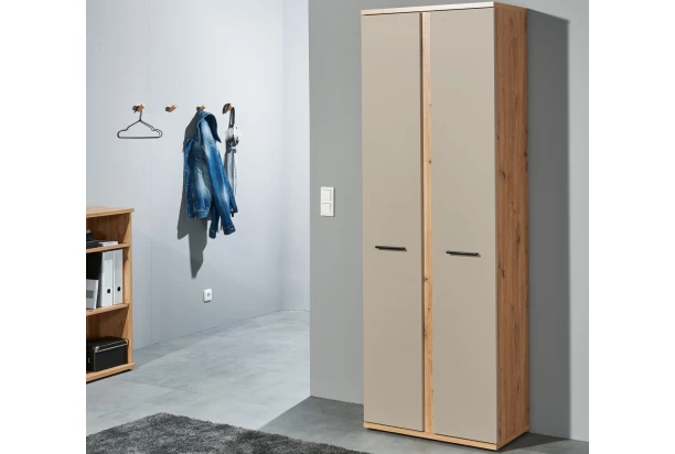 Vysoká úložná skříň z programu Kanada – moderní nábytek v kombinaci dřevodekoru dub artisan s kašmírově béžovými plochami vytvoří příjemné prostředí, kde se budete cítit útulně. Rovné linie nábytku snadno pasují do jakéhokoliv moderně zařízeného interieru. Tato 2-dveřová vysoká úložná skříňka je všestranná a je ideální do pracovny, chodby, obýváku i ložnice. Je vhodná pro organizaci a ukládání různých věcí v domácnosti.