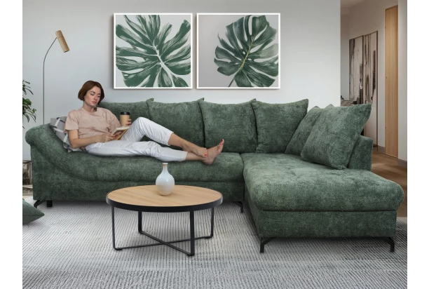 Elegantní rohová sedačka má komfortně zaoblený tvar, díky kterému poslouží i jako příjemné relaxační lehátko. Pohodlné sezení doplňují velké opěrné polštáře. Sedačka s bočním otomanem tvoří pravý roh a je očalouněna sametově hebkou strukturovanou tkaninou v barvě šedo-zelená. Praktickou stránkou sedačky je funkce rozkladu na příležitostné lůžko a úložný prostor, kam uschováte například deky nebo věci sezónní potřeby. Sedačka má černé kovové nohy v moderním designu, které zaujmou na pohled.