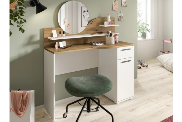 Toaletní stolek s kulatým zrcadlem a se zaoblenými tvary působí velmi elegantně. U tohoto praktického stolku oceníte odkládací poličky, na kterých budete mít vždy vše při ruce. Další věci můžete uschovat do šuplíku anebo úložného prostoru za otočnými dveřmi. Kosmetický stolek je vyroben v kombinaci bílá/dub artisan a má šířku 110 cm – najde tak snadno své místo téměř v jakékoliv ložnici, kde budete mít prostor pro veškeré kosmetické potřeby. Díky prostorné desce, zásuvkám a zrcadlu nabízí toaletní stolek dostatek prostoru pro uložení make-upu, šperků i dalších osobních věcí.