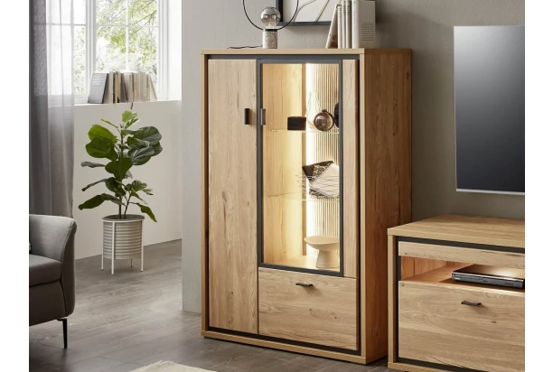 Skříňka s prosklením z programu Flores – elegantní design nábytku je doplněn kontrastním orámováním předních ploch v antracitovém provedení, které zvýrazňuje přirozené tóny útulného dubového dřevodekoru. Tento moderní nábytek tak vdechne do bytu pocit útulného prostředí, kde se budete cítit příjemně. Navíc oceníte kvalitní zpracování i snadnou údržbu, což přidává na hodnotě. Tento nábytek bude skvěle pasovat do moderního i klasicky zařízeného interieru.