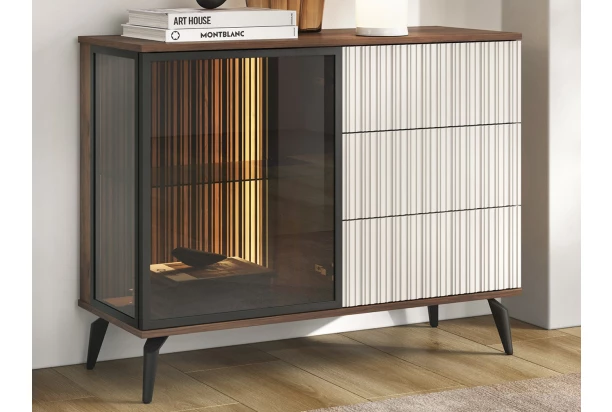 Komoda s prosklením z kolekce Vici – stylový nábytek pro ty, kteří chtějí mít interiér zařízený moderně, prakticky a zároveň útulně. Hřejivý ořechový dřevodekor doplňují kašmírově béžové povrchy. Charakteristickým prvkem je profilace na předních plochách, které nábytku dodávají hloubku a originální texturu. Prosklená část s LED osvětlením nechá vyniknout vašim dekoracím a vytvoří v interiéru útulnou večerní atmosféru. Díky vysokým kovovým nožičkám působí skříňka lehce a umožňuje snadnou údržbu podlahy, včetně využití robotického vysavače.