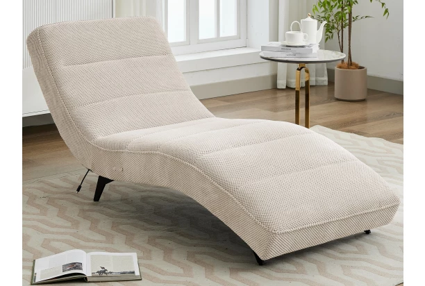Relaxační lehátko s elektrickým polohováním je skvělým designovým doplňkem do interieru a zároveň poskytne příjemný komfort během relaxace, čtení nebo sledování televize. Pomocí tlačítek si můžete snadno nastavit sklon opěradla podle aktuální potřeby. Tato komfortní lenoška je očalouněna výrazně strukturovanou látkou s 3D efektem v barvě světle béžová, která je příjemně měkkoučká na dotek a zajímavá na pohled. Moderní design lehátka doplňují černé kovové nohy, které dodávají nábytku potřebnou stabilitu.