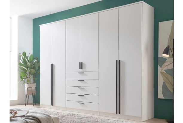 Moderní šatní skříň v bílé barvě je doplněna kontrastně černými úchyty a pasuje tak téměř do jakékoliv ložnice nebo šatny. Skříň je 270 cm široká a nabízí praktickou kombinaci otočných dveří a zásuvek. Ve vnitřních částech najdete police i kovové šatní tyče pro přehledné ukládání prádla. Ke skříni si můžete libovolně dokoupit také další vnitřní police a zmaximalizovat tak její užitkovost.