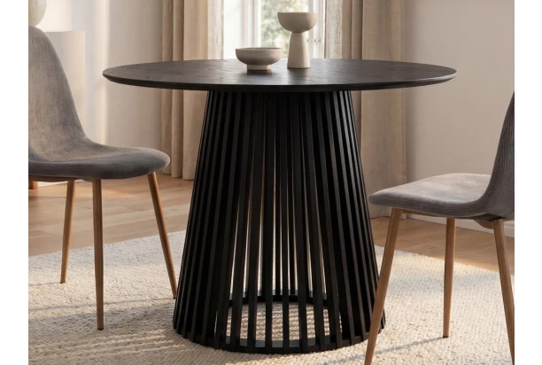 Atraktivní kulatý jídelní stůl v dekoru černý jasan má průměr 100 cm a zaujme lamelovým designem podstavy. Podstava ve tvaru kuželu zajišťuje stabilitu během každodenního využívání a zároveň působí v interieru vzdušným dojmem. Tento krásný elegantní stůl se tak stane stylovým středobodem prostoru vaší jídelny.