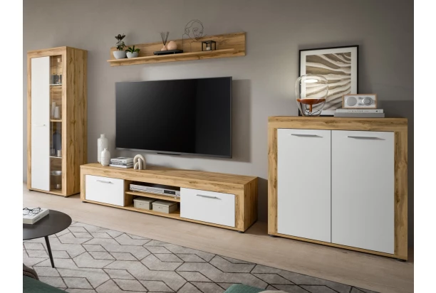 Obývací stěna z kolekce Jana – nábytek v moderním nadčasovém stylu působí elegantně a zároveň prakticky poslouží během každého dne. Přímočaré linie v kombinaci dekoru dub wotan/bílá navíc zvýrazňuje oblíbená optika širokých předních rámů. Tento nábytek je vyroben z certifikovaného dřevěného materiálu FSC® a je synonymem nejen pro kvalitu, ale také pro udržitelnost a ochranu životního prostředí. Obývací sestava obsahuje celkem 4 díly: televizní stolek o šířce 160 cm, komodu 2dveřovou, vysokou vitrínu pro vystavení vašich oblíbených předmětů a nástěnnou polici na zeď o šířce 140 cm. Tato sestava nábytku tak bude praktickou a zároveň estetickou součástí vašeho moderního bytu.