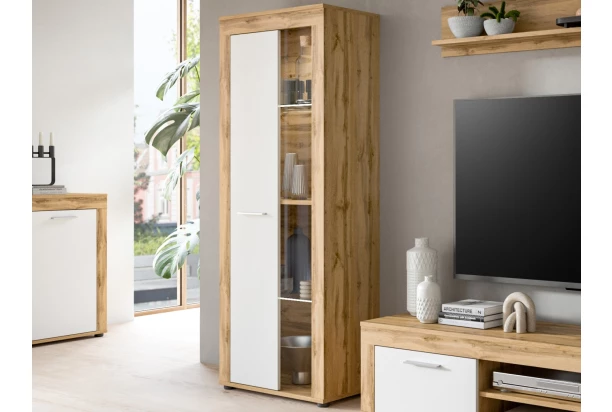 Vysoká vitrína z kolekce Jana – nábytek v moderním nadčasovém stylu působí elegantně a zároveň prakticky poslouží během každého dne. Přímočaré linie v kombinaci dekoru dub wotan/bílá navíc zvýrazňuje oblíbená optika širokých předních rámů. Tento nábytek je vyroben z certifikovaného dřevěného materiálu FSC® a je synonymem nejen pro kvalitu, ale také pro udržitelnost a ochranu životního prostředí. Vitrína o šířce 60 cm má částečně prosklené dveře, za kterými najdete police, kam můžete vystavit své oblíbené předměty. Tato vitrína tak bude praktickou a zároveň estetickou součástí moderního bytu.