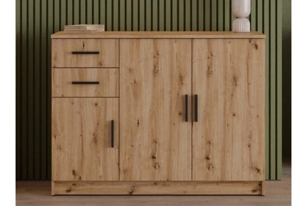 Komoda o šířce 118 cm z modelové řady Universal obsahuje 3 dveře a 2 zásuvky. Je využitelná v jakékoliv místnosti. V dřevodekoru dub artisan.