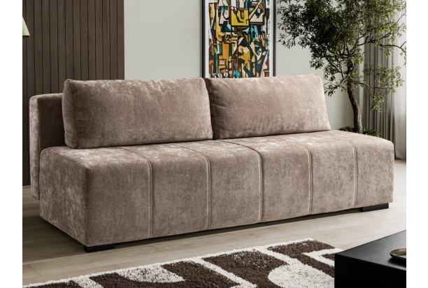 Menší pohovka s polštáři nabízí praktickou rozkládací funkci i úložný prostor, kam můžete uschovat různé věci. Očalouněna měkkou žinilkovou látkou v barvě světle hnědá. Rozměrově pasuje nejen do obýváku, ale i například do pokoje pro hosty anebo jinam.
