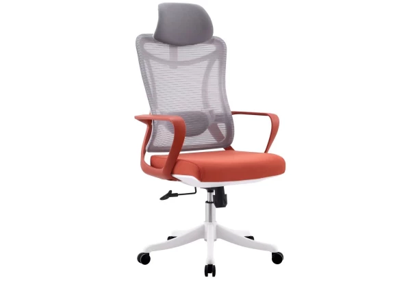 Moderní kancelářská židle má příjemně měkký sedák a pohodlný anatomický tvar. Kromě výškového nastavení má funkci houpací a nastavitelný sklon opěrky hlavy. Potažena kombinací šedé síťoviny a oranžové látky. Oceníte také zvýšenou nosnost této židle.
