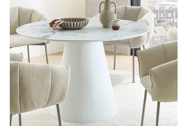 Kulatý jídelní stůl v imitaci bílého mramoru má průměr 120 cm a dokonale se hodí do moderně zařízeného interieru. Moderní design stolu dotváří bílá podnož ve tvaru kuželu, která mu dodává stabilitu během každodenního používání. Zkosené boční hrany jídelní desky jsou zajímavým detailem. Tento kulatý stůl skvěle vynikne vedle moderního nábytku, ale i jako solitér se židlemi uprostřed místnosti.