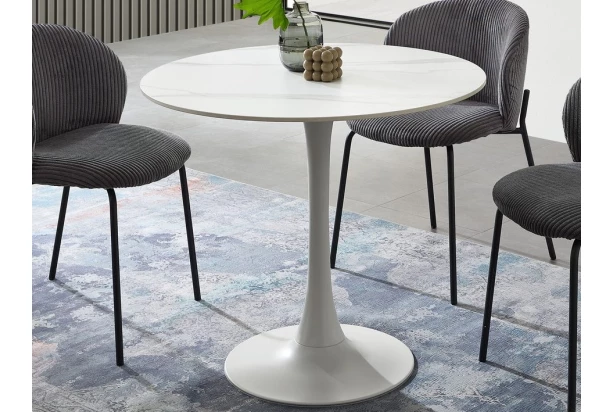 Kulatý jídelní stůl s keramickou deskou v imitaci bílého mramoru má průměr 90 cm, působí luxusně na pohled a dokonale se hodí do moderního interieru, kde vynikne. Stůl má bílou kovovou podnož v zaobleném tvaru, která mu dodává stabilitu při každodenním používání. Tento stůl je rozměrově vhodný i do malého prostoru jídelny nebo kuchyně.