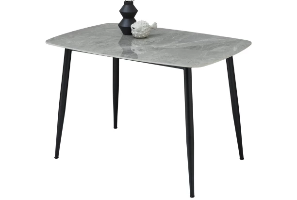 Jídelní stůl s keramickou deskou v imitaci leštěného šedého kamene působí luxusně, zaujme na pohled a vynikne v moderně laděné jídelně. Stabilní podnož z černého kovu dodává stolku dobrou stabilitu. Obdélný stůl o velikosti 120×80 cm má zaoblené strany a působí tak velmi elegantně.