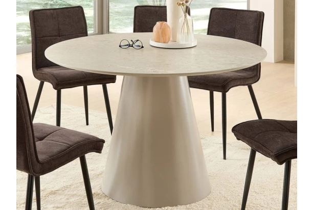 Kulatý jídelní stůl v imitaci šedého kamene má průměr 120 cm a dokonale se hodí do moderně zařízeného interieru. Moderní design stolu dotváří šedá podnož ve tvaru kuželu, která mu dodává stabilitu během každodenního používání. Zkosené boční hrany jídelní desky jsou zajímavým detailem. Tento kulatý stůl skvěle vynikne vedle moderního nábytku, ale i jako solitér se židlemi uprostřed místnosti.