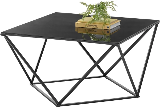 Moderní konferenční stolek v extravagantním designu má černou kovovou podnož v geometrických tvarech, která zaujme na pohled. Čtvercová horní plocha o velikosti 80×80 cm je vyrobena z tvrzeného černého skla a dotváří celkově lehkou optiku stolku. Tento stolek krásně vynikne v moderně zařízeném obýváku, kde perfektně doplní prostor před sedačkou nebo gaučem.