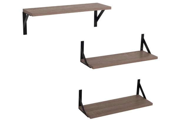 Sada 3 kusů polic o šířce 45 cm je vyrobena v dekoru dub sonoma se zavěšením na černé kovové konzole. Police tak vypadají velmi moderně. Konzole lze univerzálně namontovat na horní nebo dolní stranu police.