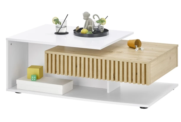 Konferenční stolek se šuplíkem má atraktivní členitý design. Vyroben v kombinaci bílých ploch a útulného dřevodekoru dub artisan. Boční plochy doplňují dekorační lamely, které zaujmou na pohled. Stolek má stabilní konstrukci, aby odolávala každodennímu využívání. Členité odkládací plochy, otevřená přihrádka i zásuvka poslouží pro přehledné odkládání věcí každodenní potřeby, časopisů, knížky a různých ovladačů. Stolek je umístěn na kolečkách a umožňuje tak snadné přesouvání v případě potřeby.