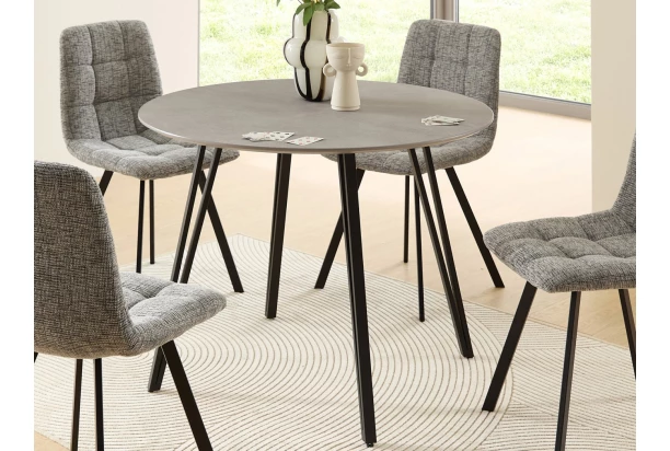 Kulatý jídelní stůl o průměru 100 cm se dokonale hodí do malého prostoru. Vyroben v imitaci šedého kamene. Moderní styl dotváří černé kovové nohy, které stolu dodávají potřebnou stabilitu pro každodenní užívání a díky členité optice působí vzdušně. Tento kulatý stůl se bude dokonale hodit do moderního prostoru jídelny nebo kuchyně.