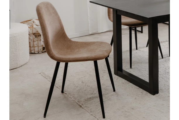 Pohodlně zaoblená židle na černých kovových nohách je stabilní a sedák má očalouněn měkkou strukturovanou látkou v barvě světle hnědá, která je velmi útulná. Tato židle se svým univerzálním stylem pasuje k téměř každému stolu a do každé jídelny.
