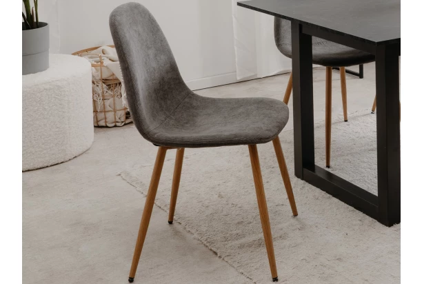 Pohodlně zaoblená židle na kovových nohách v imitaci dřeva je stabilní a sedák má očalouněn měkkou strukturovanou látkou v barvě šedá, která je velmi útulná. Tato židle se svým univerzálním stylem pasuje k téměř každému stolu a do každé jídelny.