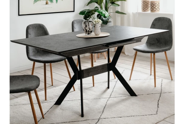 Obdélný jídelní stůl na moderní kovové podnoži zaručuje stabilitu a zaujme jídelní plochou o velikosti 160×90 cm, která je vyrobena v imitaci tmavě šedého břidlicového kamene. Boční zkosená hrana jídelní plochy je příjemným optickým detailem. Jídelní plochu lze snadno rozšířit na 200 cm a usadit tak ke stolu více osob, ať již rodinu anebo přátele. Středová konstrukce z černého kovu je stabilní a zároveň v prostoru jídelny působí vzdušně.