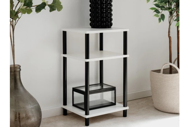Úzký regál v bílé barvě má šířku 34 cm a lze ho univerzálně využít i jako odkládací stolek. Regál má 2 přihrádky pro ukládání jakýchkoliv věcí a černá kovová konstrukce zajišťuje stabilitu.