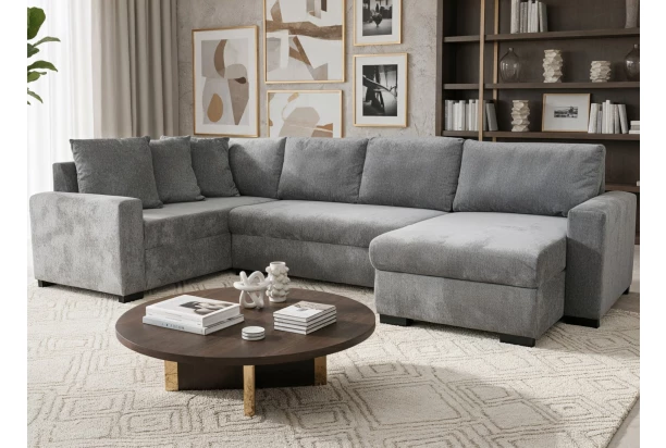 Sedací souprava ve tvaru písmene U nabízí ideální kombinaci pohodlí, praktičnosti a elegantního vzhledu. Díky příjemnému sezení v kombinaci s velkými opěrnými polštáři poskytuje dostatek prostoru pro každodenní relaxaci celé rodiny. Přestože je sedačka velmi prostorná, její rozměry zůstávají kompaktní, takže se snadno začlení i do menších obývacích pokojů. Velkou výhodou této sedací soupravy je také její univerzálnost – stranu s otomanem lze při montáži umístit na pravou anebo levou stranu, takže si sedačku snadno přizpůsobíte podle dispozice vašeho obývacího pokoje. Součástí je praktická funkce rozkladu, která během chvilky vytvoří velkou plochu vhodnou pro příležitostné přespání nebo pohodové lenošení. Pod sedákem se navíc nachází úložný prostor, kam můžete uložit například polštáře, deky, sezónní věci nebo třeba umělý vánoční stromeček s ozdobami, které během roku nepotřebujete mít po ruce. Celá sedací souprava je očalouněna příjemně měkkou látkou v kouřově šedé barvě, která působí moderně a zároveň se snadno kombinuje s ostatním vybavením interiéru.