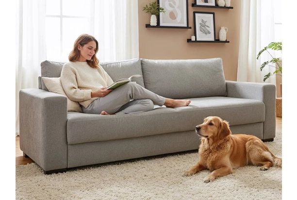 Široká nadčasová pohovka je prostorná, pohodlná a zároveň praktická. Očalouněna látkou v barvě holubí šedá a doplněna bočním proševem na područkách. Nabízí rozkládací funkci na příležitostné lůžko i úložný prostor pod sedákem, kam snadno uschováte například deky, lůžkoviny nebo třeba věci sezónní potřeby. Trojmístná pohovka bude skvěle pasovat nejen do obýváku, ale prakticky poslouží i třeba v pokoji pro hosty. Prostorný sedák a velké opěrné polštáře poskytnou příjemné pohodlí během každého dne.