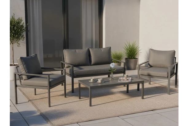 Proměňte svou zahradu či terasu v moderní oázu klidu s touto elegantní zahradní sedací soupravou. Set zahrnuje 2místnou pohovku, dvě pohodlná křesla a praktický stolek, které společně vytvářejí ideální místo pro relaxaci i setkání s rodinou či přáteli. Design spojuje čisté linie a nadčasovou kombinaci antracitového kovu s umělou imitací dřevěných prken – materiály jsou zároveň odolné vůči vlivům venkovního prostředí. Konstrukce z kovu zajišťuje stabilitu během používání. Souprava skvěle doplní moderní exterier, kde si během dne vychutnáte ranní kávu na slunci a večer příjemnou atmosféru při posezení pod širým nebem. Tato zahradní souprava nábytku nabízí styl, komfort a praktičnost v jednom.