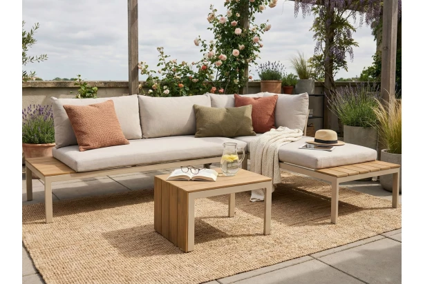 Vytvořte si venkovní oázu klidu a stylu – místo, kde se design snoubí s pohodlím. Tato elegantní zahradní sestava v kombinaci imitace přírodního dřeva s jemně béžovým kovem propojuje moderní design s hřejivým dojmem přírody. Nadčasové linie, vzdušná konstrukce a harmonické barevné ladění dokonale zapadnou do každé zahrady, na terasu i balkon. Sestava nábytku obsahuje praktický stolek a rohovou pohovku, kterou můžete snadno přizpůsobit podle aktuální nálady – díky chytrému modulárnímu řešení během chvilky vytvoříte dvě pohodlná relaxační lehátka anebo jedno velké relaxační lehátko pro příjemný odpočinek – ideální na sluneční odpoledne, odpočinek s knihou nebo večerní posezení s přáteli. Proměňte tak svou terasu v místo, kam se budete těšit každý den.