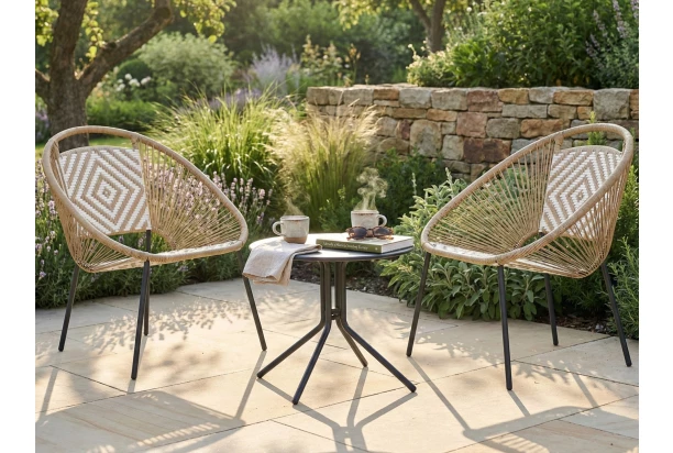 Malý 3dílný zahradní set z kovu a imitace béžového ratanu spojuje elegantní vzhled s praktickým využitím. Díky přirozenému béžovému provedení působí lehce a vzdušně a snadno zapadne do každého exteriéru. Zaoblené křesílko má sedák a opěradlo doplněno atraktivním béžovo-bílým výpletem, kterým zaujme na pohled. Set obsahuje 2 pohodlná křesílka a kulatý stolek – ideální pro ranní kávu, odpolední relax i večerní posezení ve dvou. Konstrukce je pevná, stabilní a nenáročná na údržbu. Imitace ratanu je odolná vůči povětrnostním vlivům a zachovává si svůj krásný vzhled po dlouhou dobu. Tato sada nábytku bude rozměrově dobře pasovat nejen na zahradu a venkovní terasu, ale i na jakýkoliv balkon, kde vytvoří příjemné prostředí pro posezení.